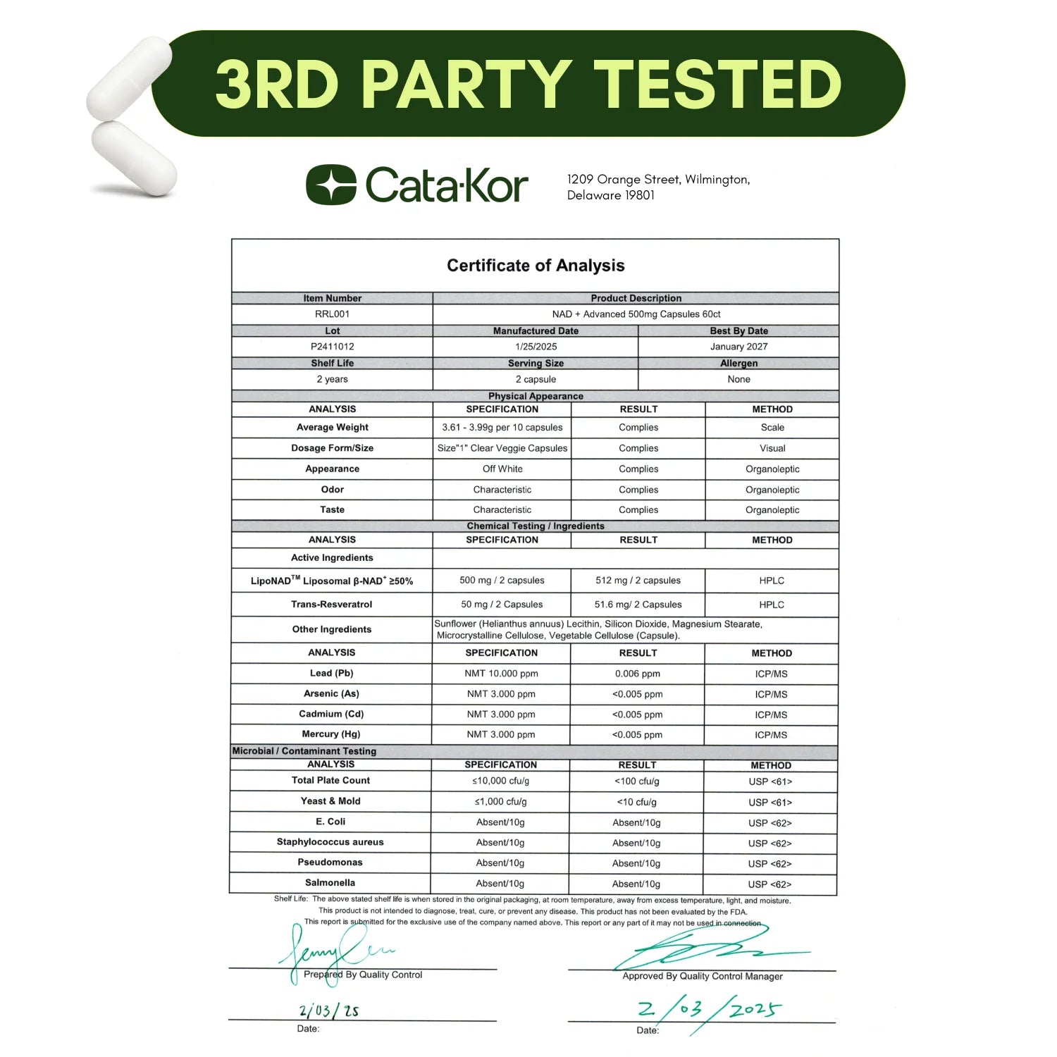 Support healthy aging and boost cellular energy with Cata-Kor NAD+ Advanced, a premium supplement formulated with 500 mg of LipoNAD+™ and 50 mg of Trans-Resveratrol. This advanced formula delivers 9.3x greater absorption than standard NAD+ supplements, helping enhance NAD+ levels naturally. Crafted in the USA and third-party tested for purity and potency, this powerful anti-aging supplement promotes mitochondrial function, DNA repair, and overall vitality. Previously known as Reus Research NAD900, now rebranded and improved under Cata-Kor.
