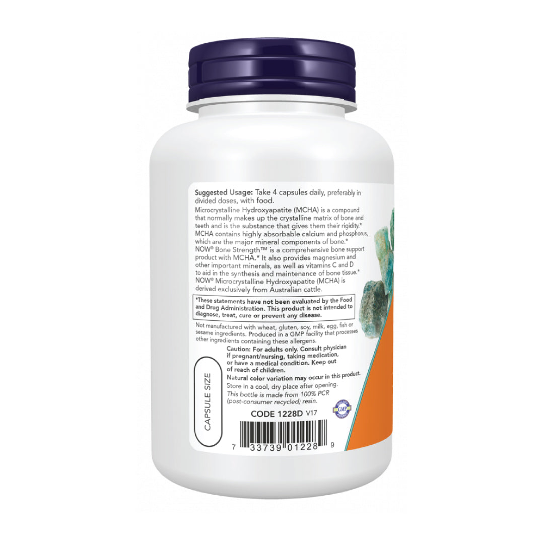 Support strong bones and teeth with NOW® Bone Strength™ Capsules, a comprehensive formula featuring Microcrystalline Hydroxyapatite (MCHA) – a highly absorbable form of calcium and phosphorus that mimics the natural composition of bone tissue. Sourced exclusively from Australian cattle, MCHA helps promote bone density and rigidity.